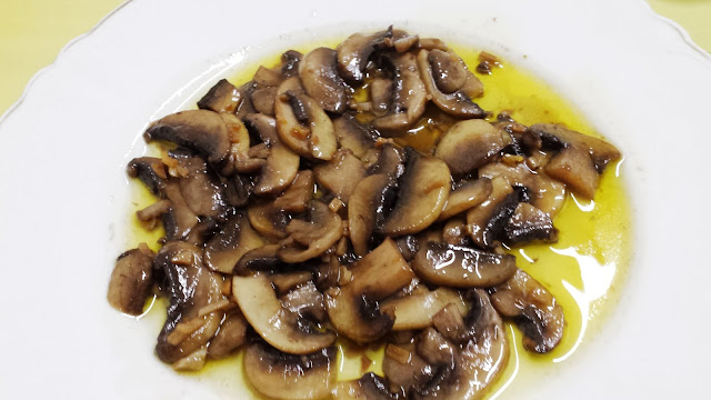 | UNA VEZ DORADO EL AJO AÑADIMOS LOS CHAMPIÑONES Y DEJAMOS QUE SE HAGAN Y SALTEEN A NUESTRO GUSTO, PROBANDO SI ES NECESARIO |